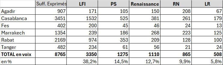 في المغرب وعكس التوجه الأوروبي والفرنسي، حصد حزب فرنسا الأبية 3350 صوتا بنسبة 38 في المائة، وحل في المركز الثاني الحزب الاشتراكي بـ 1275 صوتا بنسبة 15 في المائة، حزب ماكرون “النهضة” حصل على 1110 صوتا بنسبة 13 في المائة، التجمع الوطني 865 صوتا بنسبة 10 في المائة.