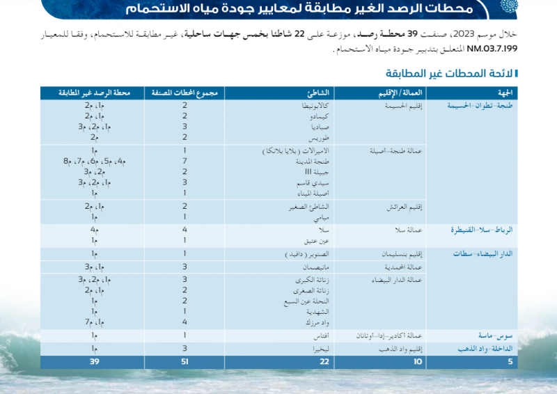 التقرير الذي يرصد جودة مياه الشواطئ والرمال برسم سنة 2024، يصنف مياه كلا من البلايا والبلايا بلانكا وجبيلة 3 وسيدي قاسم بأنها ذات جودة مياه غير مطابقة للمعايير، وتترواج جودة المياه بين رديئة (غير صالحة للسباحة) كما هو الحال بالنسبة لشاطئ جبيلة 3 وجودة مقبولة تهم أساسا شواطئ البلايا والبلايا بلانكا.