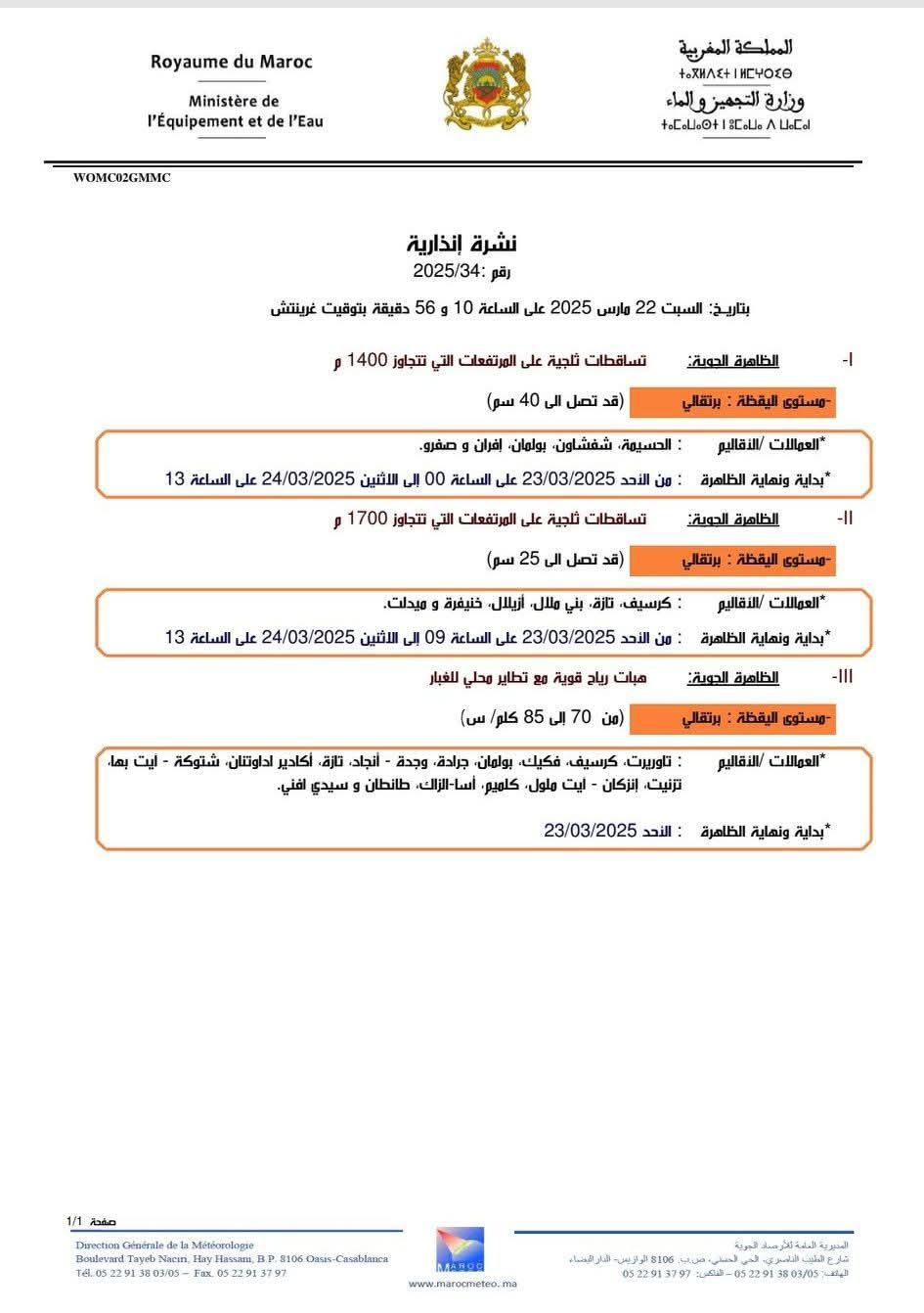 أصدرت مديرية الأرصاد الجوية نشرة إنذارية من المستوى البرتقالي تشمل يومي الأحد والإثنين 23 و24 مارس، محذرة من رياح قوية وتطاير الغبار وتساقط الثلوج.
