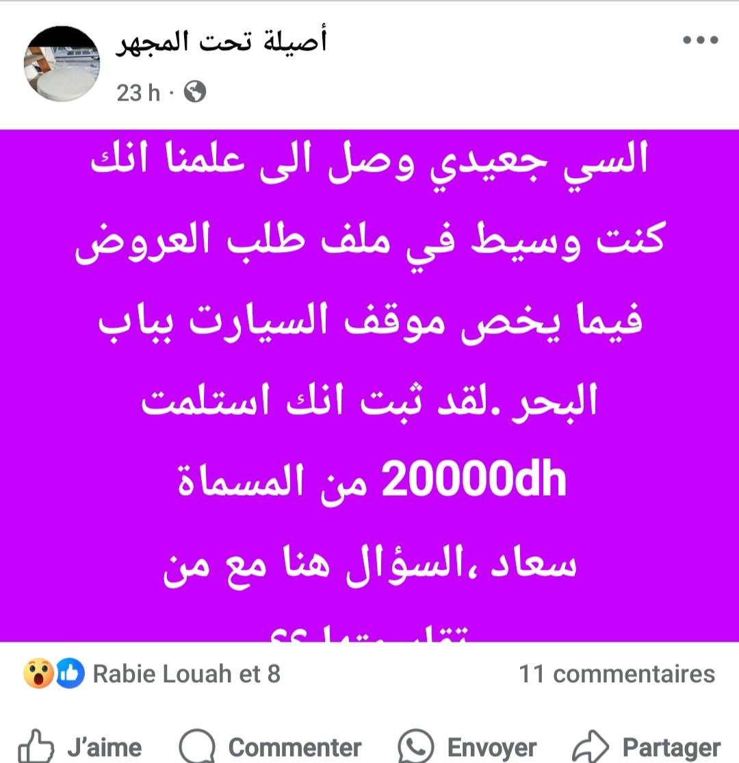 ووجهت للنائب في جماعة أصيلة أحمد الجعيدي، اتهامات عبر سلسة من التدوينات مجهولة الهوية، زعمت حصوله على المبلغ مقابل التوسط لفوز “سعاد” بطلب الاستغلال المؤقت لموقف السيارات.