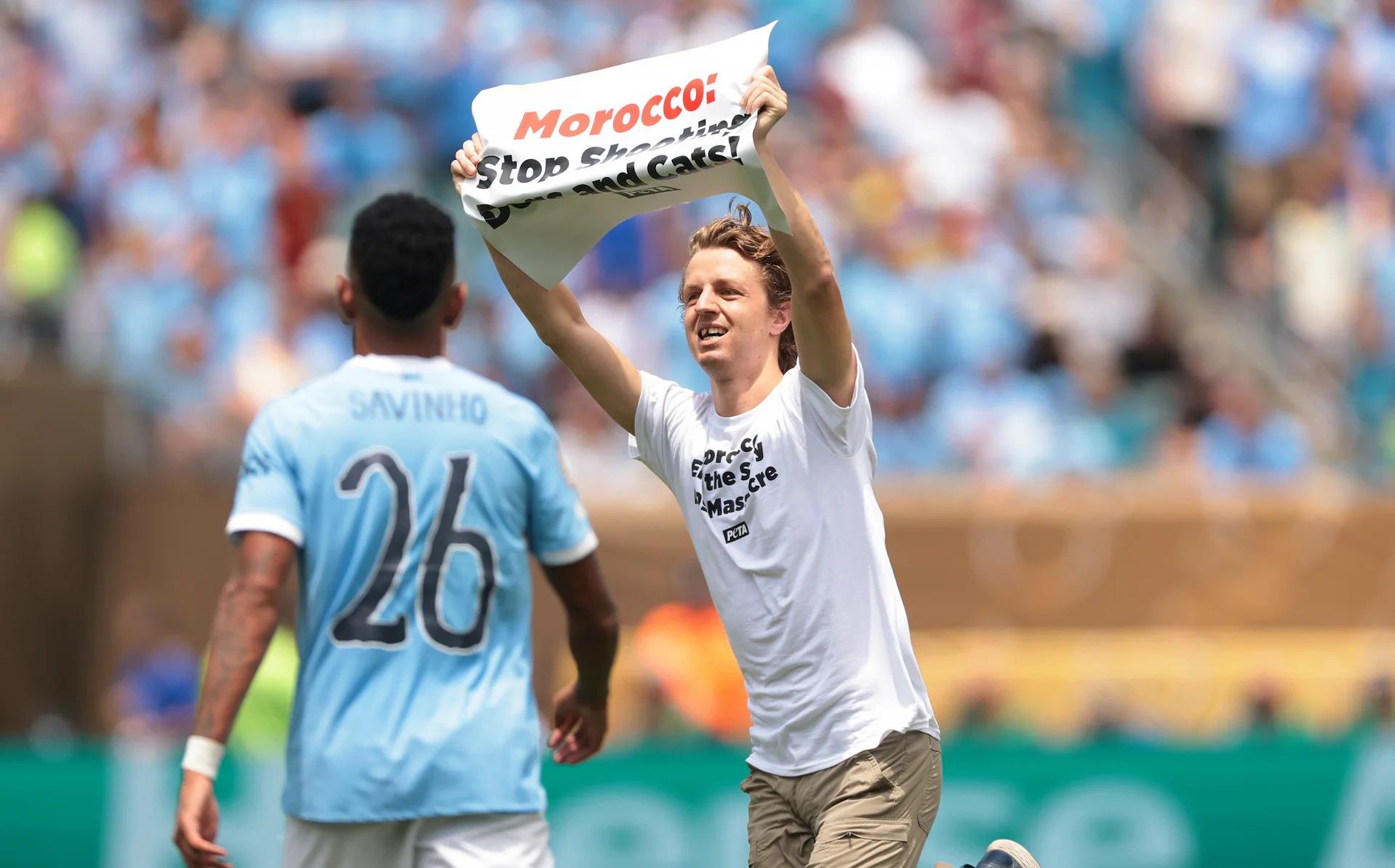 الناشط مرتديًا قميصًا كتب عليه: “المغرب، أوقفوا مجزرة الكلاب الضالة”. اقتحم الملعب وهو يحمل لافتة تقول: “المغرب: توقفوا عن إطلاق النار على الكلاب والقطط”.