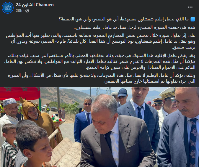 المصدر خلص إلى أن “عامل الإقليم لا يقبل بمثل هذه التصرفات ولا يشجع عليها بأي شكل من الأشكال. وأشار إلى أن الصورة المتداولة جرى إخراجها عن سياقها الحقيقي وتم استغلالها بشكل مغلوط من طرف البعض”.