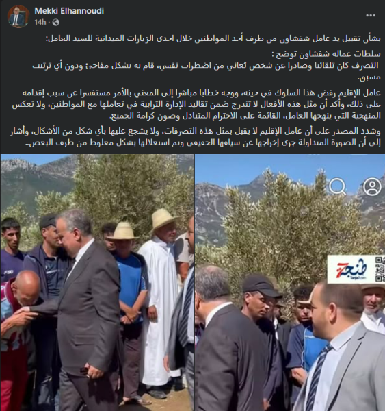 وبحسب التوضيح فإن “العامل رفض هذا السلوك في حينه. ووجه خطابا مباشرا إلى المعني بالأمر مستفسرا عن سبب إقدامه على ذلك. وأكد أن مثل هذه الأفعال لا تندرج ضمن تقاليد الإدارة الترابية في تعاملها مع المواطنين. ولا تعكس المنهجية التي ينهجها العامل القائمة على الاحترام المتبادل وصون كرامة الجميع”.