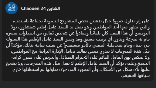وسائل إعلام في شفشاون وكذلك بعض النشطاء وحتى المنتخبين أصدروا بشكل متزامن “توضيحا”. في توضيحهم، اتهموا الرجل بـ “الاضطراب النفسي”. وقالوا إن العامل تفاجأ وأن ما حدث لم يكن مرتبًا.