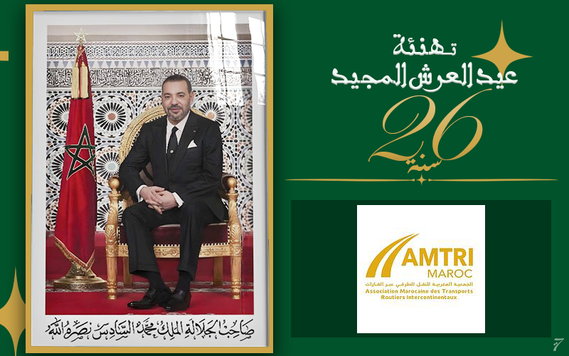 تَقدمت الجمعية المغربية للنقل الطرقي عبر القارات “AMTRI-MAROC” بتهنئة إلى جلالة الملك محمد السادس. وذلك بمناسبة الذكرى السادسة والعشرين لتربع جلالته على عرش أسلافه المنعمين.