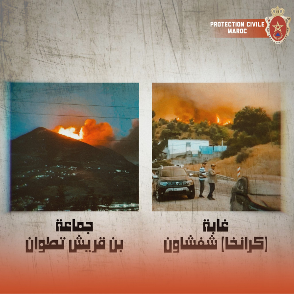 وفق المصدر ذاته فإن شمال المغرب عرف حريقين غابويين بكل من منطقة كرانخا بإقليم شفشاون وجماعة بن قريش بإقليم تطوان. فرق الوقاية المدنية تدخلت مدعومة بوسائل لوجستيكية وعناصر ميدانية، للسيطرة على ألسنة اللهب. رغم صعوبة التضاريس وقوة الرياح، العمليات تستمر لغاية الآن..
