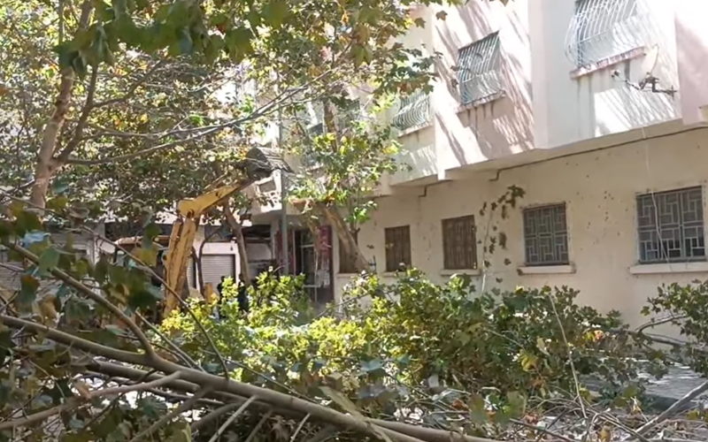هذه الأدوات الثقيلة، التي وُظفت في اقتلاع الأشجار من جذورها، أدت إلى تدمير عشرات الأشجار في وقت قياسي.