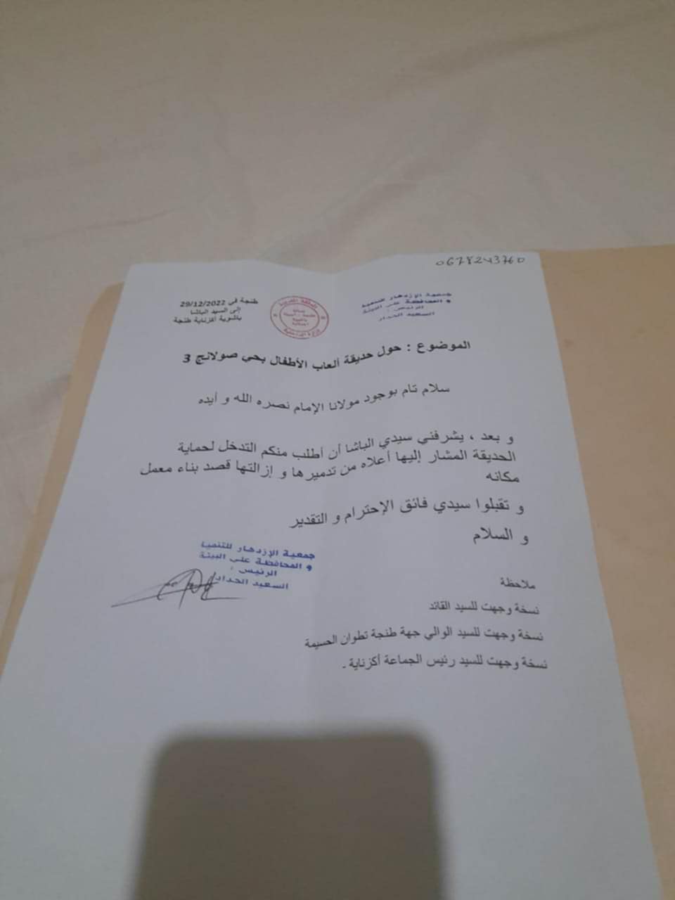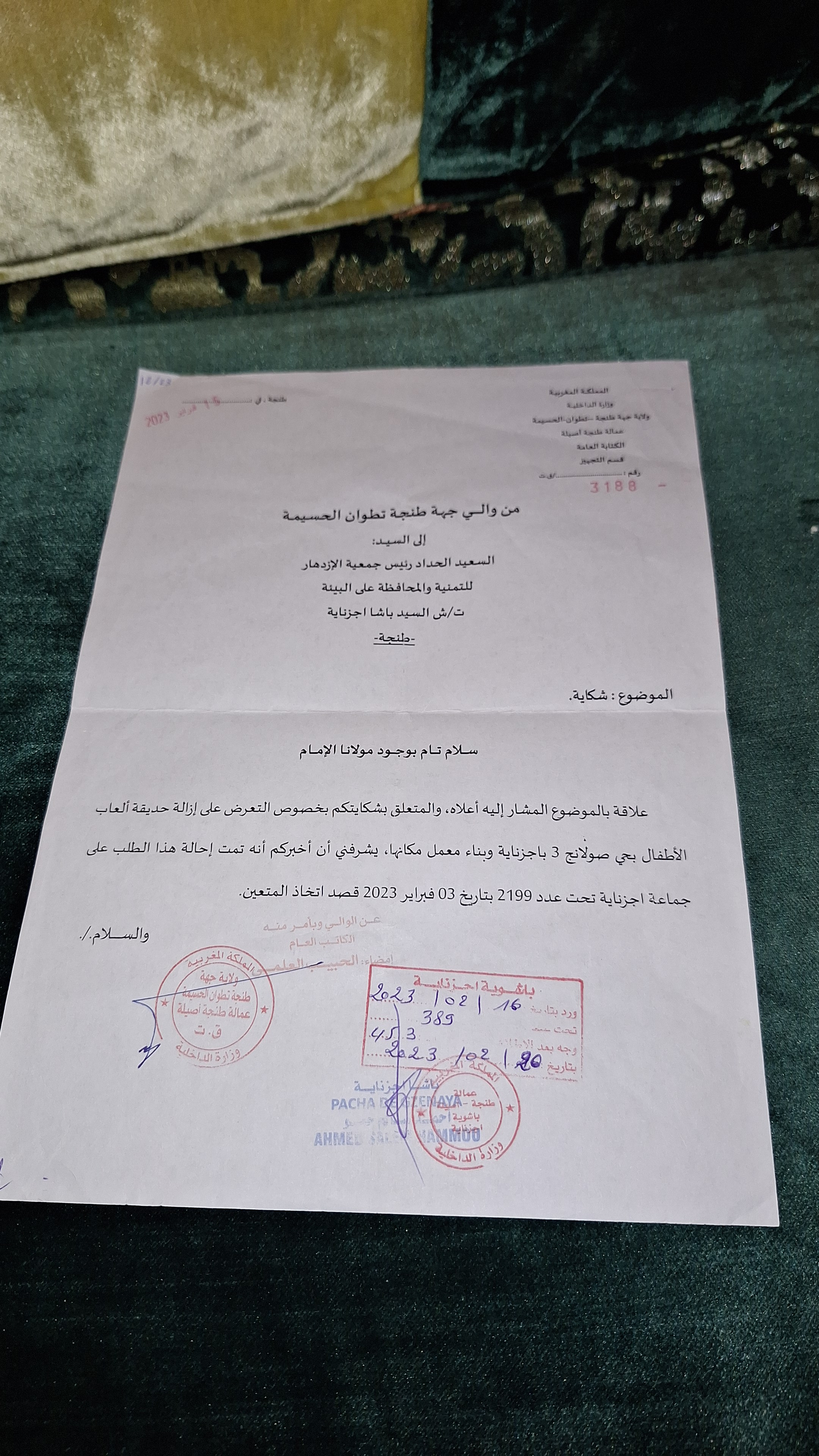 هذه ليست المرة الاولى حيث حاولو الاجهاز على الحديقة في شهر دجنبر 2022 قمنا انذاك بوضع شكاية للسيد الباشا السيد القائد والسيد الرئيس لجماعة اكزناية كذلك للسيد والي الجهة وذلك بتارؤخ 29دجنبر2022 وتصلنا بجواب كتابي من السيد الوالي بتاريخ 20 فبراير 2023 كما ه. مبين في هذه الوثيقة