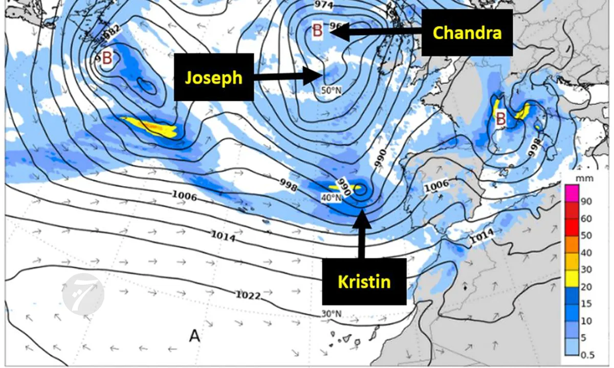 هذه العواصف الثلاث تشكلت ضمن نظام منخفض جوي معقد في شمال الأطلسي، حيث دارت جوزيف وشاندرا حول بعضهما، مما أدى إلى توليد كريستين كعاصفة ثانوية قوية. النتيجة كانت تأثيرات متراكمة على أرض مشبعة بالمياه من عواصف سابقة (مثل فرانسيس وإنغريد في وقت سابق من الشهر)، مما زاد من مخاطر الفيضانات والانهيارات.