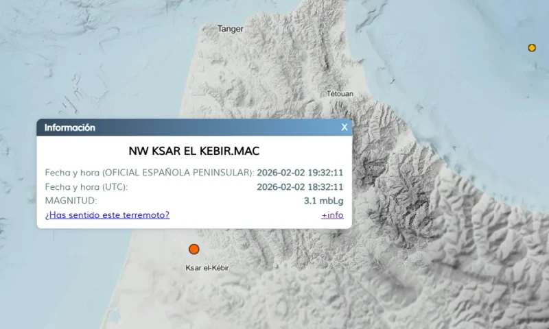 سجلت مصالح المراقبة الزلزالية هزة أرضية بقوة 3.1 درجات على مقياس ريشتر في الساعة 19:32 مساء اليوم الاثنين 2 فبراير (بالتوقيت المحلي)، شمال غرب مدينة القصر الكبير بإقليم العرائش.
