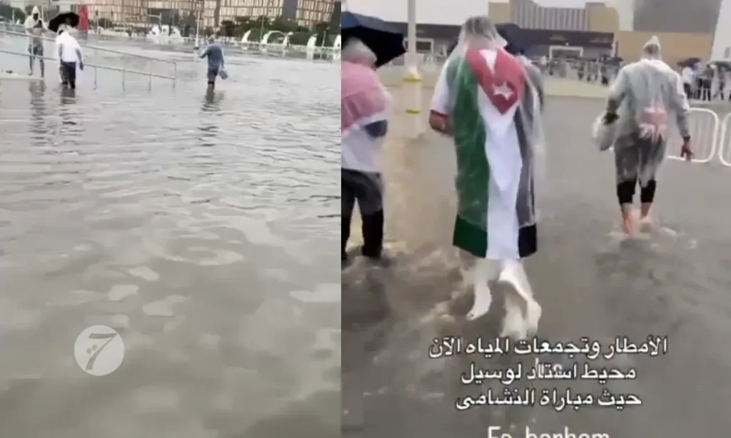 Several fans shared clips of the “floods,” but they confirmed that no decision had been made regarding delaying or postponing the match, especially after a decision was made to stop the third-place match between Saudi Arabia and the UAE, after the stadium and stands were flooded.