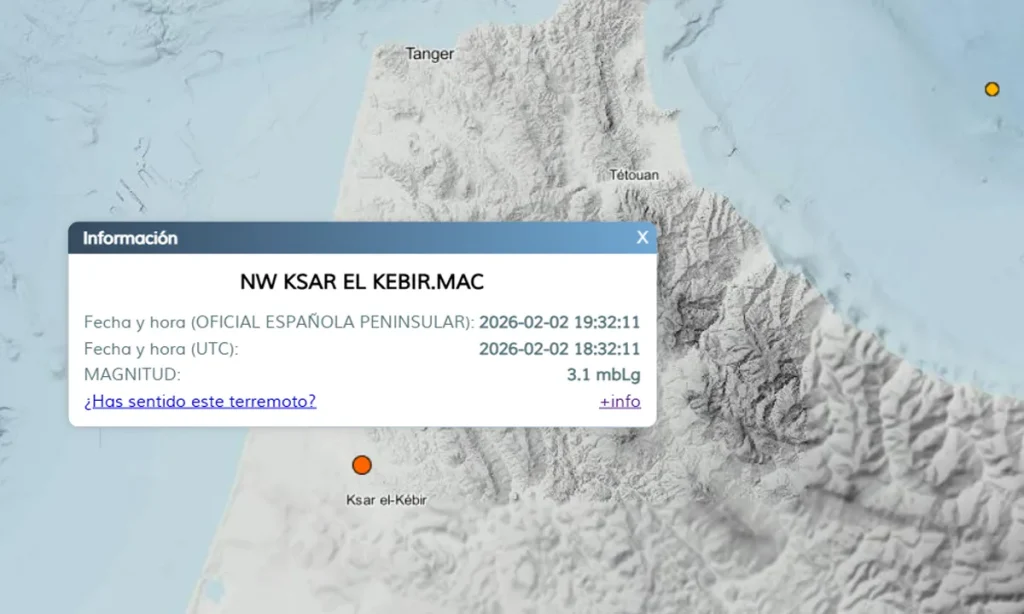 The seismic monitoring services recorded an earthquake with a magnitude of 3.1 degrees on the Richter scale at 19:32 this evening, Monday, February 2 (local time), northwest of the city of Ksar al-Kebir in the Larache region.