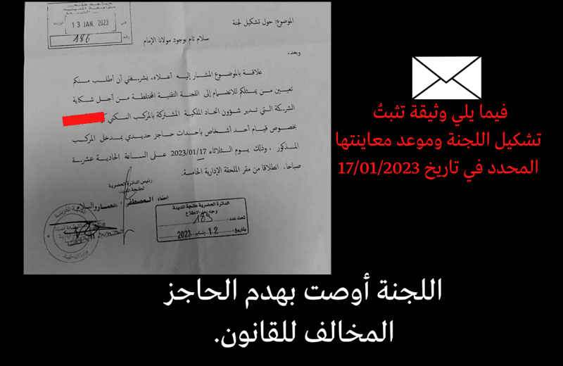 لجنة المعاينة المشكلة أكدت عدم قانونية “الحاجز”، وقد تقرر تحديد يوم 24 يناير 2023 موعدا لهدم الحاجز بحضور قائد الملحقة الإدارية الخامسة وممثل عن ولاية الجهة وممثلي المصالح الجماعية، إلى جانب عناصر القوات المساعدة والأمن الوطني.