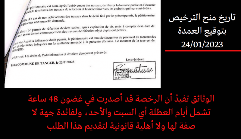 التحقيق أظهر أيضا أن طلب الرخصة تم إيداعه بتاريخ 19 يناير 2023 وصدر عن عمدة طنجة يوم 23 يناير 2023، وذلك في ظرف 48 ساعة، ويشمل المعاينة والزيارة الميدانية وتوقيعات المصالح الداخلية ومراقبة المصالح الخارجية رغم تصادف نهاية الأسبوع.