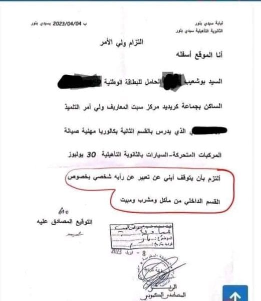 انتشرت خلال الساعات الماضية وثيقة تظهر توقيع ولي أمر تلميذ على التزام بعدم تطرق ابنه لمأكل ومشرب ومبيت القسم الداخلي الخاص بمؤسسة 30 يوليوز في سيدي بنور.