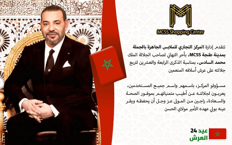 تتقدّم إدارة المركز التجاري للملابس الجاهزة بالجملة بمدينة طنجة MCSS، بأحر التهاني لصاحب الجلالة الملك محمد السادس، بمناسبة الذكرى الرابعة والعشرين لتربع جلالته على عرش أسلافه المنعمين.
