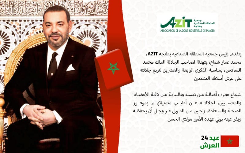 يتقدّم رئيس جمعية المنطقة الصناعية بطنجة AZIT، السيد محمد عمار شماع، بتهنئة لصاحب الجلالة الملك محمد السادس، بمناسبة الذكرى الرابعة والعشرين لتربع جلالته على عرش أسلافه المنعمين.