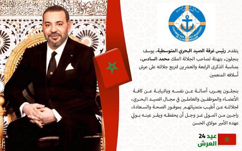 يتقدّم رئيس غرفة الصيد البحري المتوسطية، السيد يوسف بنجلون، بتهنئة لصاحب الجلالة الملك محمد السادس، بمناسبة الذكرى الرابعة والعشرين لتربع جلالته على عرش أسلافه المنعمين.