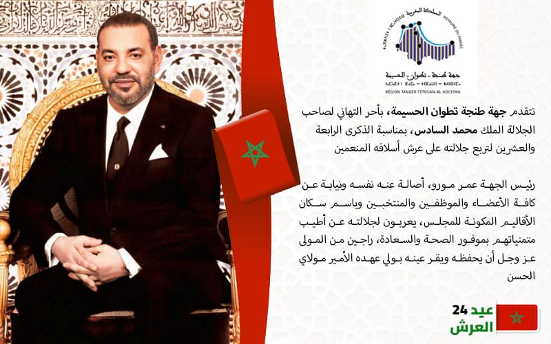 يتقدم رئيس جهة طنجة تطوان الحسيمة، السيد عمر مورو، بتهنئة لصاحب الجلالة الملك محمد السادس، بمناسبة الذكرى الرابعة والعشرين لتربع جلالته على عرش أسلافه المنعمين.