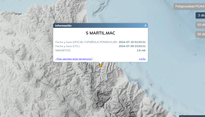 المعهد الإسباني قال إن الهزة سجلت على الساعة الواحدة و3 دقائق بتوقيت إسبانيا ( 12 و3 دقائق ليلا) بتوقيت المغرب، وقد وقعت على عمق 57 كيلومترا.