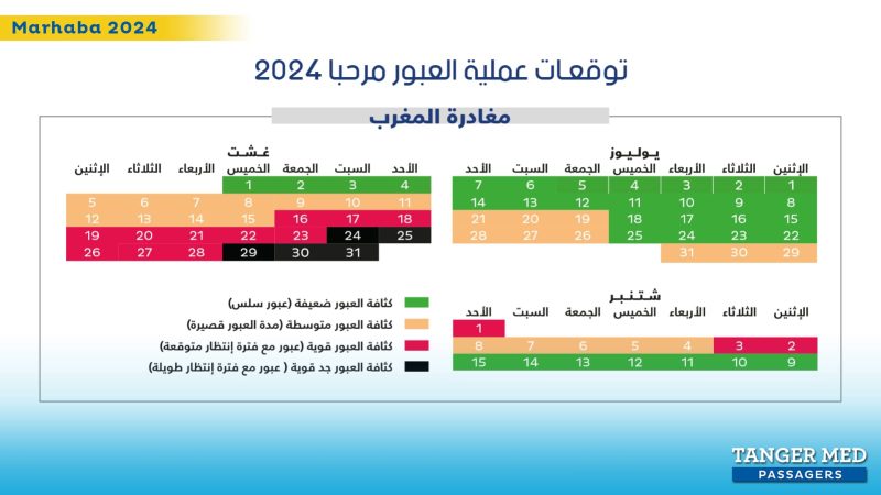 كشف ميناء طنجة المتوسط عن توقعات العبور برسم عملية مرحبًا 2024، من أجل تمكين المسافرين من التعرف على حالة العبور في الميناء من أجل التخطيط لرحلتهم بشكل مسبق وتفادي ساعات الانتظار في أوقات الذروة.