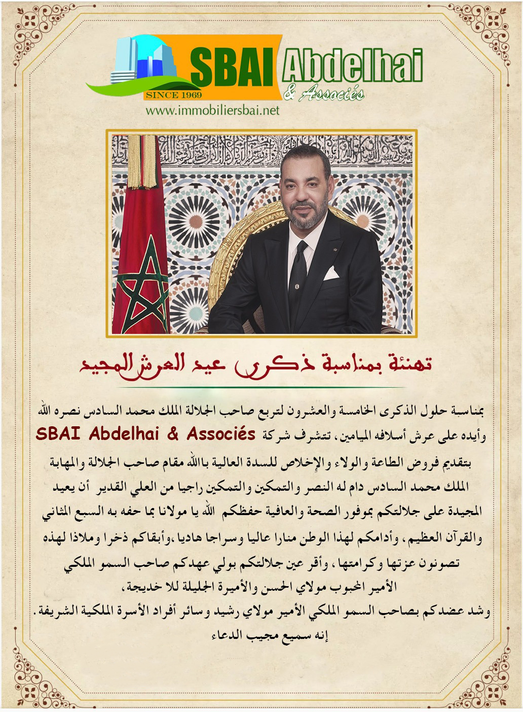 بمناسبة الذكرى الخامسة والعشرين لتربع الملك محمد السادس على عرش أسلافه المنعمين، يتقدم جميع العاملين في شركة السباعي عبد الحي وشركاؤه للعقار بتهانيهم لجلالة الملك.