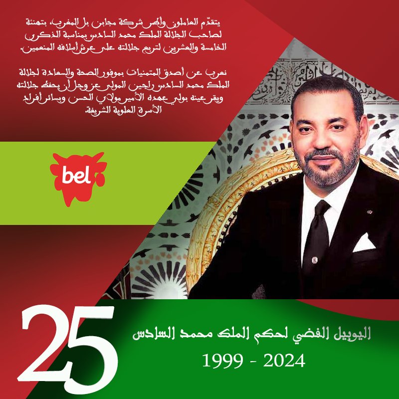 بمناسبة الذكرى الخامسة والعشرين لتربع الملك محمد السادس على عرش أسلافه المنعمين، يتقدم جميع الأطر وكافة العاملين في شركة مجابن بل المغرب “Fromageries Bel Maroc”، بتهانيهم لجلالة الملك.