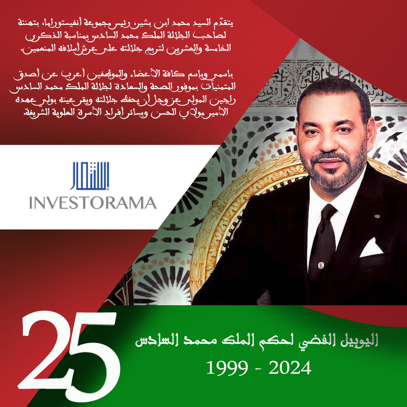 بمناسبة الذكرى الخامسة والعشرين لتربع الملك محمد السادس على عرش أسلافه المنعمين، يتقدم السيد محمد ابن بشير، رئيس مجموعة “INVESTORAMA”، بتهانئه لجلالة الملك.