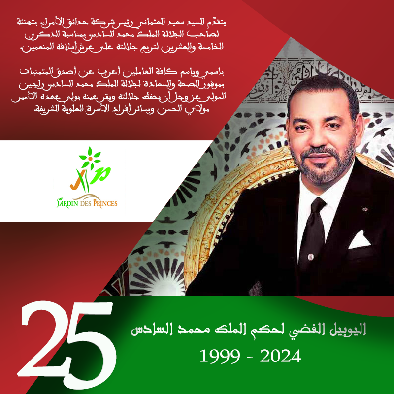 بمناسبة الذكرى الخامسة والعشرين لتربع الملك محمد السادس على عرش أسلافه المنعمين، يتقدم السيد سعيد العثماني، رئيس شركة حدائق الأمراء، بتهانئه لجلالة الملك.