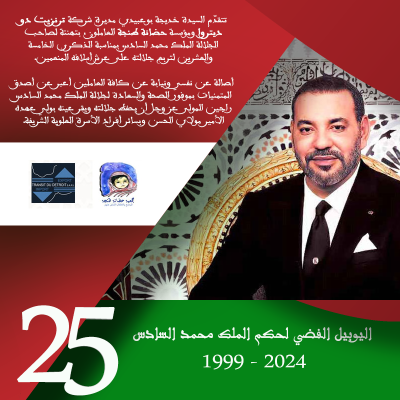 بمناسبة الذكرى الخامسة والعشرين لتربع الملك محمد السادس على عرش أسلافه المنعمين، تتقدم السيدة خديجة بوعبيدي، مديرة شركة “Transit Du Detroit” ورئيسة مؤسسة “حضانة طنجة”، بتهانئها لجلالة الملك.