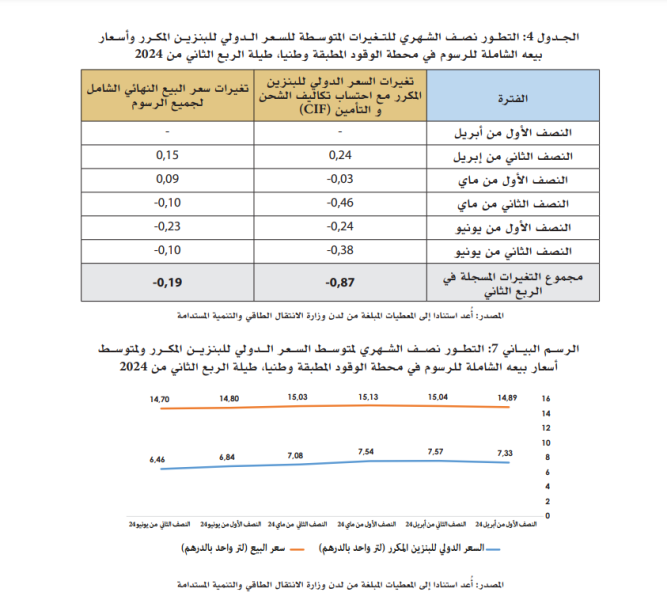 وبحسب التقرير فإن الفاعلين عمدوا إلى تطبيق مجمل الانخفاضات المسجلة في تكلفة الشراء على سعر التفويت المطبق على الصعيد الوطني، حيث بلغ متوسط التغيير بين ناقص 0.66 درهم للتر بخصوص الغازوال، وناقص 0.33 درهم للتر بالنسبة للبنزين، وهي انخفاضات مماثلة تقريبا لمستويات الشراء أي ناقص 0.71 درهم للتر بالنسبة للغازوال و 0.21 درهم للتر بالنسبة للبنزين، بفارق وصل إلأى 25 و28 سنتيم على التوالي.