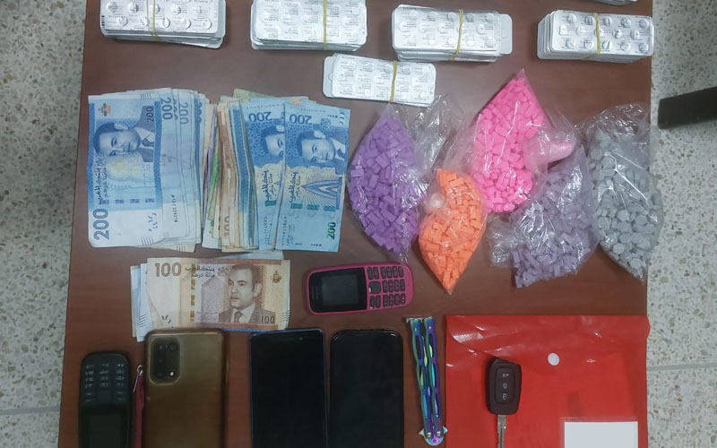 وجرى توقيف المشتبه فيهم متلبّسين بحيازة وترويج المخدرات، حيث تم العثور بحوزتهم على 3460 قرص مخدر، بينها 2460 قرص طبي مخدر من نوع “ريفوتريل” و1000 قرص مهلوس من “حبوب النشوة” (إكستازي)، علاوة على سلاح أبيض ومبلغ يُشتبه كونه من متحصلات هذا النشاط الإجرامي.