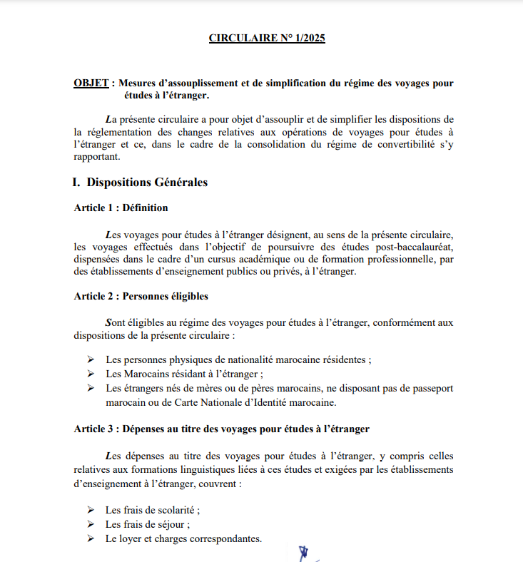 وتهدف الدورية، التي يمكن الاطلاع عليها عبر الموقع الإلكتروني لمكتب الصرف، إلى تسهيل وتبسيط مقتضيات نظام الصرف المتعلقة بعمليات السفر للدراسة بالخارج، وذلك في إطار تعزيز وتحرير نظام الصرف المرتبط بهذا المجال.