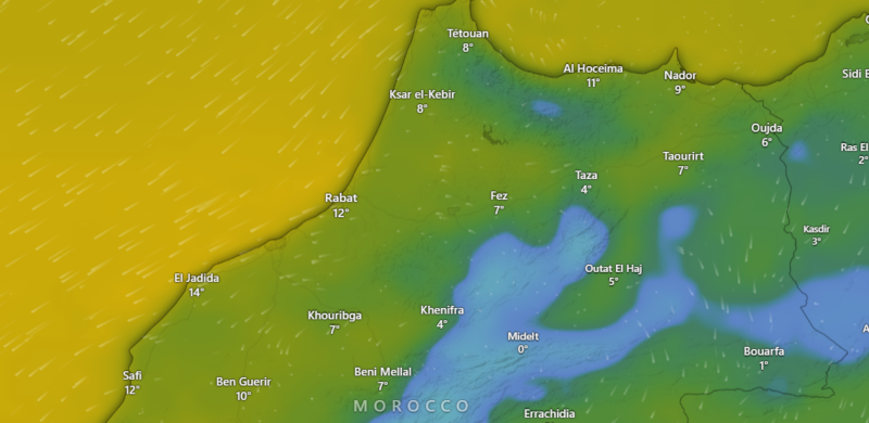 وأضافت أن درجات الحرارة الدنيا ستتراوح ما بين ناقص 04 و01 درجة، والعليا ما بين 03 و09 درجات، خلال نفس الفترة، بكل من عمالات وأقاليم جرادة وتاوريرت والمرتفعات التابعة لاقاليم كرسيف وتازة والحسيمة وشفشاون وزاكورة والرشيدية وتزنيت وطاطا.