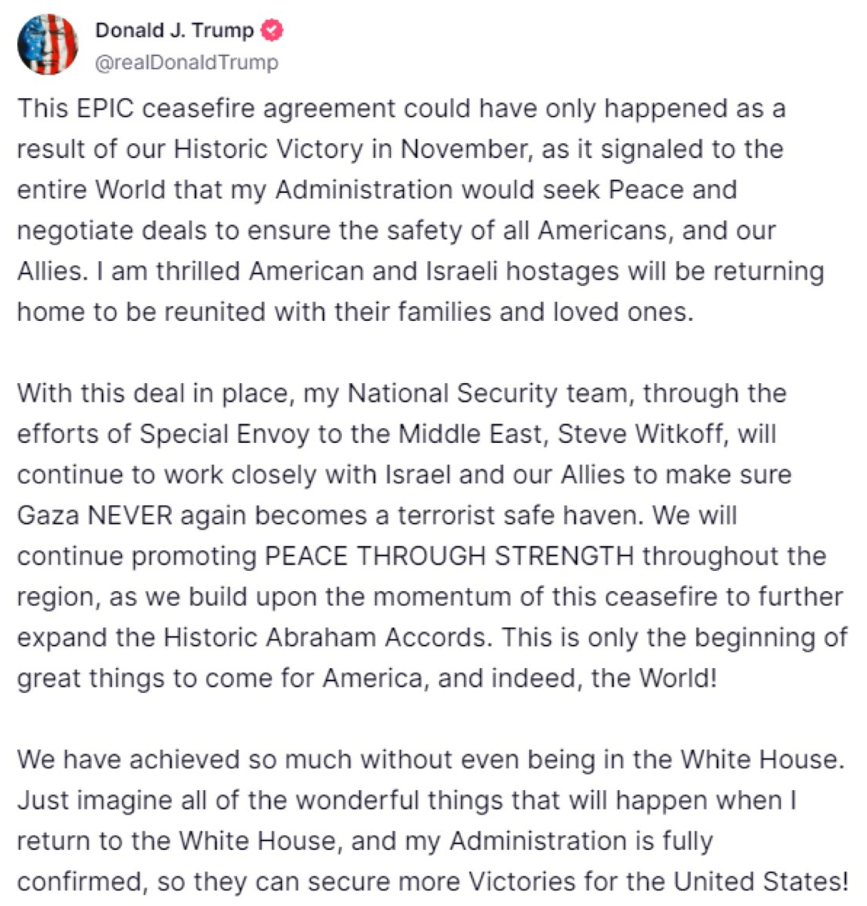 أعلن الرئيس الأمريكي المنتخب دونالد ترمب التوصل لاتفاق إطلاق النار في غزة، وقال إن هذا الاتفاق الاستثنائي، جاء بفضل فوزه الكبير في انتخابات نونبر الماضية.