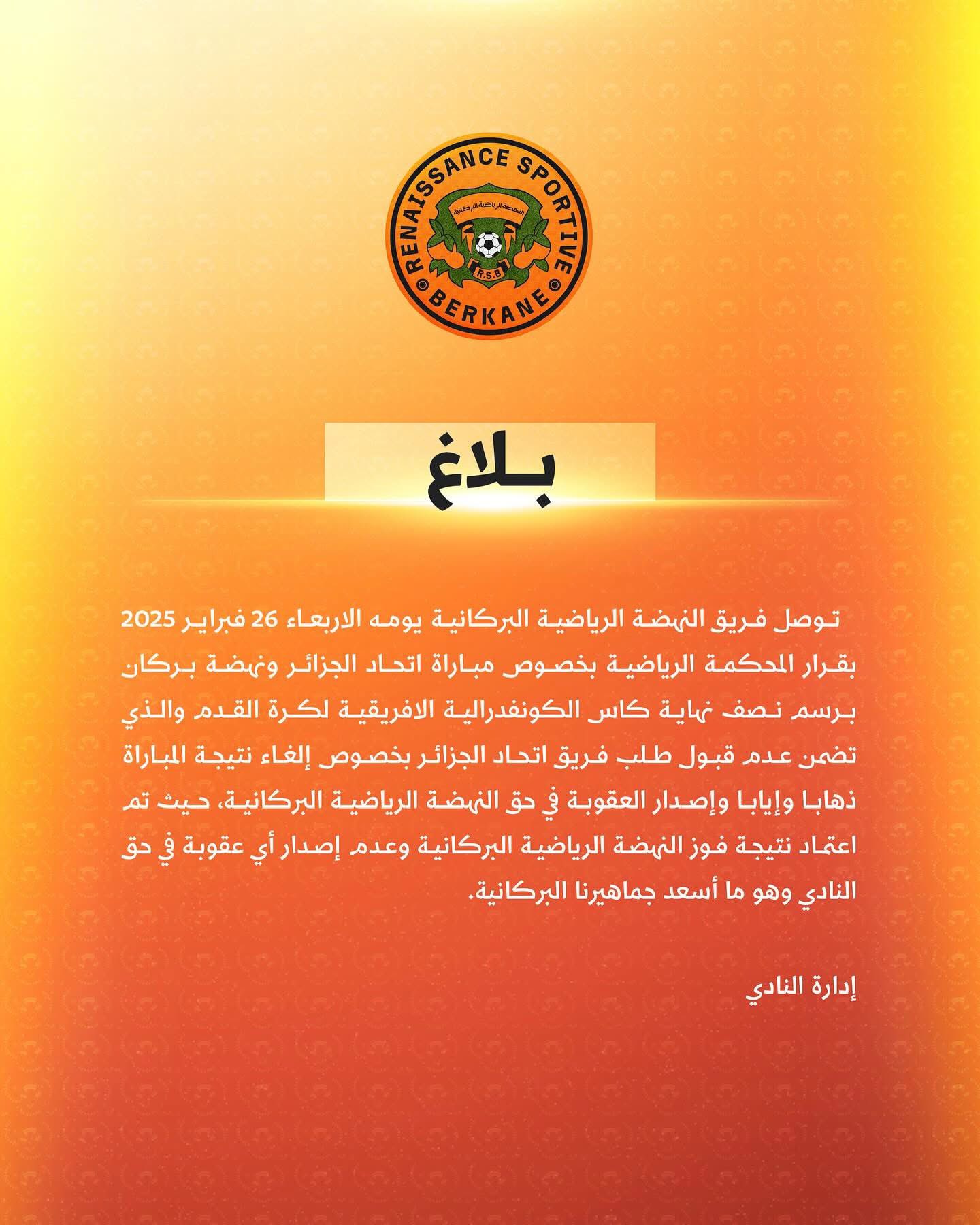 قال نهضة بركان إن المحكمة الرياضية قررت اعتماد نتيجة فوزه على اتحاد الجزائر وعدم إصدار أي عقوبة في حق النادي.