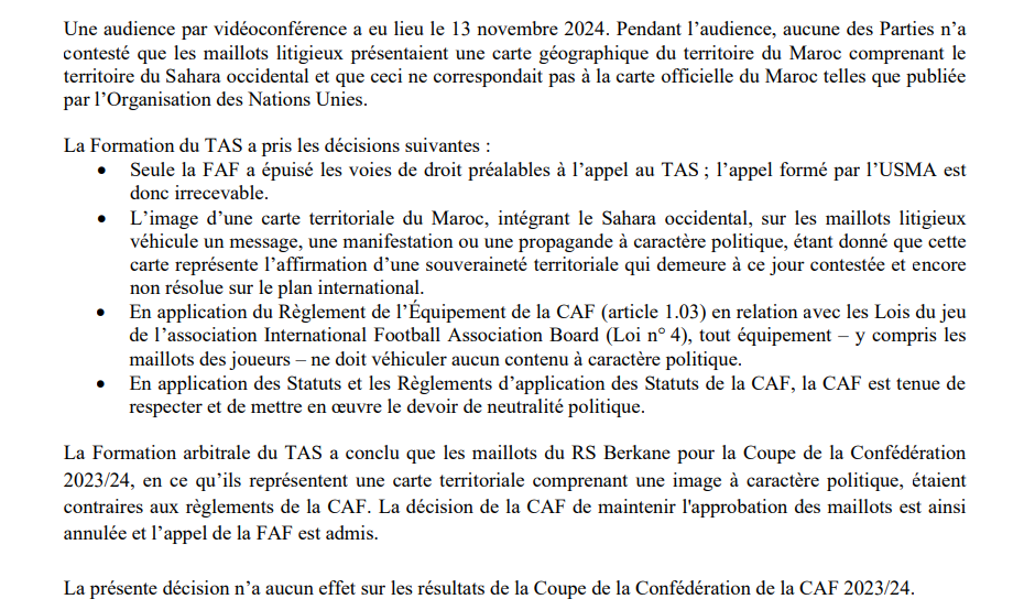 ويبدو أن الفريق البركاني ركز فقط على نتيجة “المقابلة”، لكنه تجاهل الحكم الأصلي الذي يشكك في الوحدة الترابية للمغرب، ويعتبر الخريطة التي وضعها النادي على أقمصته “مخالفة وذات طابع سياسي” خصوصا وأنها تتضمن منطقة “متنازع عليها”، وفق نص الحكم.
