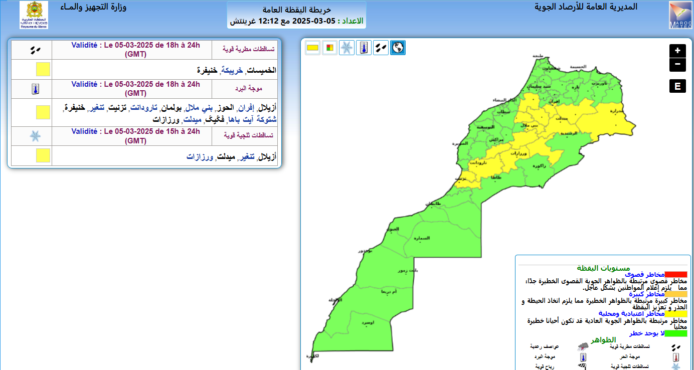 خريطة اليقظة من جانبها الخاصة بالأرصاد الجوية، لا تتوقع بدورها أي أمطار قوية على مستوى طنجة، مشيرة إلى عدم وجود أي مخاطر في المنطقة يومي الأربعاء والخميس.