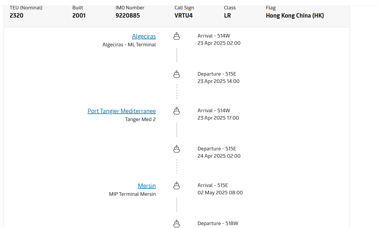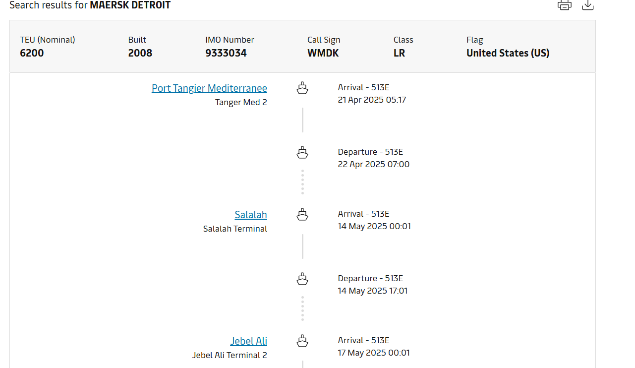 ميرسك نشرت أيضا برنامج السفينة “ديترويت”، والتي من المرتقب أن تغادر ميناء طنجة المتوسط يوم 22 أبريل، لتتوجه إلى ميناء صلالة في سلطنة عمان، ولا يظهر البرنامج توجه السفينة إلى ميناء حيفا في إسرائيل.