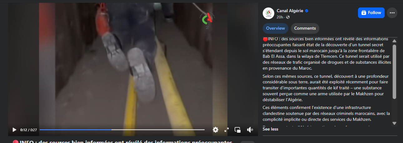 دون خجل، عرض التلفزيون الجزائري الرسمي فيديو نفق سبتة، كأنه نفق جديد من أجل تهريب المخدرات أكتشف بين تلمسان والمغرب.