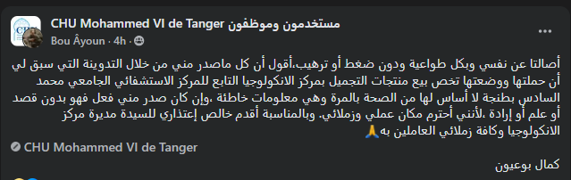 وعبر مجموعة خاصة بمستخدمي المستشفى الجامعي، قال بوعيون “أصالةً عن نفسي وبكل طواعية ودون ضغط أو ترهيب، أقول أن كل ماصدر مني من خلال التدوينة التي سبق لي أن حملتها ووضعتها تخص بيع منتجات التجميل بمركز الأنكولوجيا التابع للمركز الاستشفائي الجامعي محمد السادس بطنجة لا أساس لها من الصحة بالمرة وهي معلومات خاطئة، وإن كان صدر مني فعل فهو بدون قصد أو علم أو إرادة، لأنني أحترم مكان عملي وزملائي. وبالمناسبة أقدم خالص اعتذاري للسيدة مديرة مركز الأنكولوجيا وكافة زملائي العاملين به”.