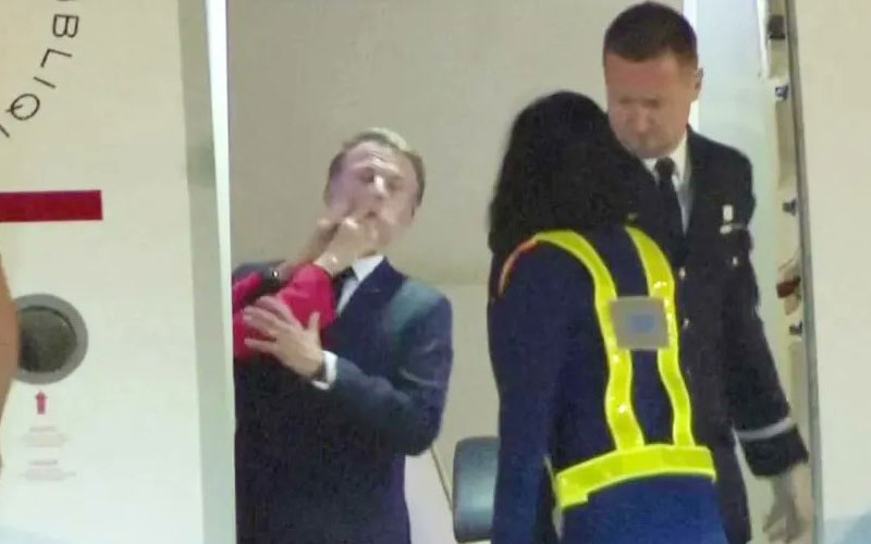 الفيديو، الذي سجلته عدة وكالات صحفية دولية غربية، يُظهر الرئيس وهو يخرج من الطائرة مساء الأحد عندما وضعت بريجيت ماكرون، التي كانت ترتدي الأحمر، يديها فجأة على وجهه، حسبما أفادت فرانس إنفو.