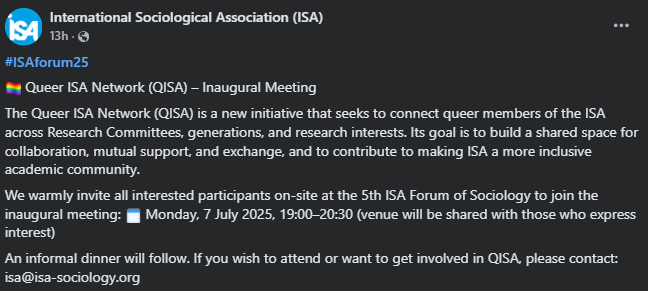 الجمعية تعقد المنتدى الخامس للسوسيولوجيا في الرباط ابتداء من 6 يوليوز 2025. خلال المنتدى أعلنت أنها ستدشن شبكتها الخاصة بالمثليين. أكدت أن الهدف منها هو بناء مساحة مشتركة للتعاون والدعم المتبادل لأعضائها المثليين. كما تهدف إلى المساهمة في جعل الجمعية الدولية لعلم الاجتماع مجتمعًا أكاديميًا أكثر شمولية.