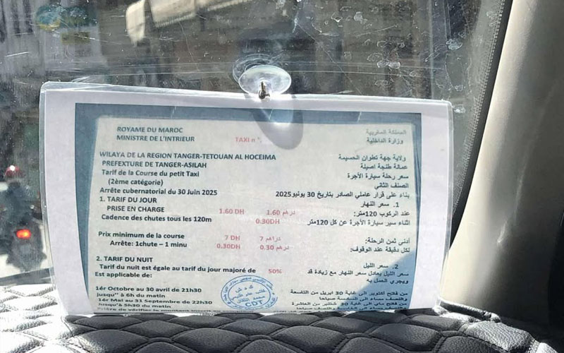 ووِفق ما ينص عليه القانون المنظم للقطاع، فإن ورقة التسعيرة الخاصة بسيارات الأجرة يجب أن تحمل خاتما من المصلحة المختصة بولاية جهة طنجة. ويجب إشهارها للزبون بشكل واضح على لوحة القيادة.
