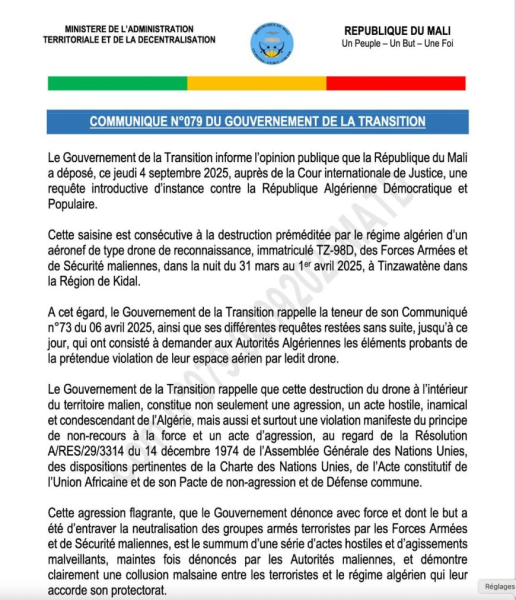يوم الخميس الموافق 4 شتنبر 2025، تقدمت مالي بشكوى رسمية أمام محكمة العدل الدولية (CIJ) ضد الجزائر، متهمة إياها بارتكاب “فعل عدواني” و”انتهاك جسيم للقانون الدولي”.