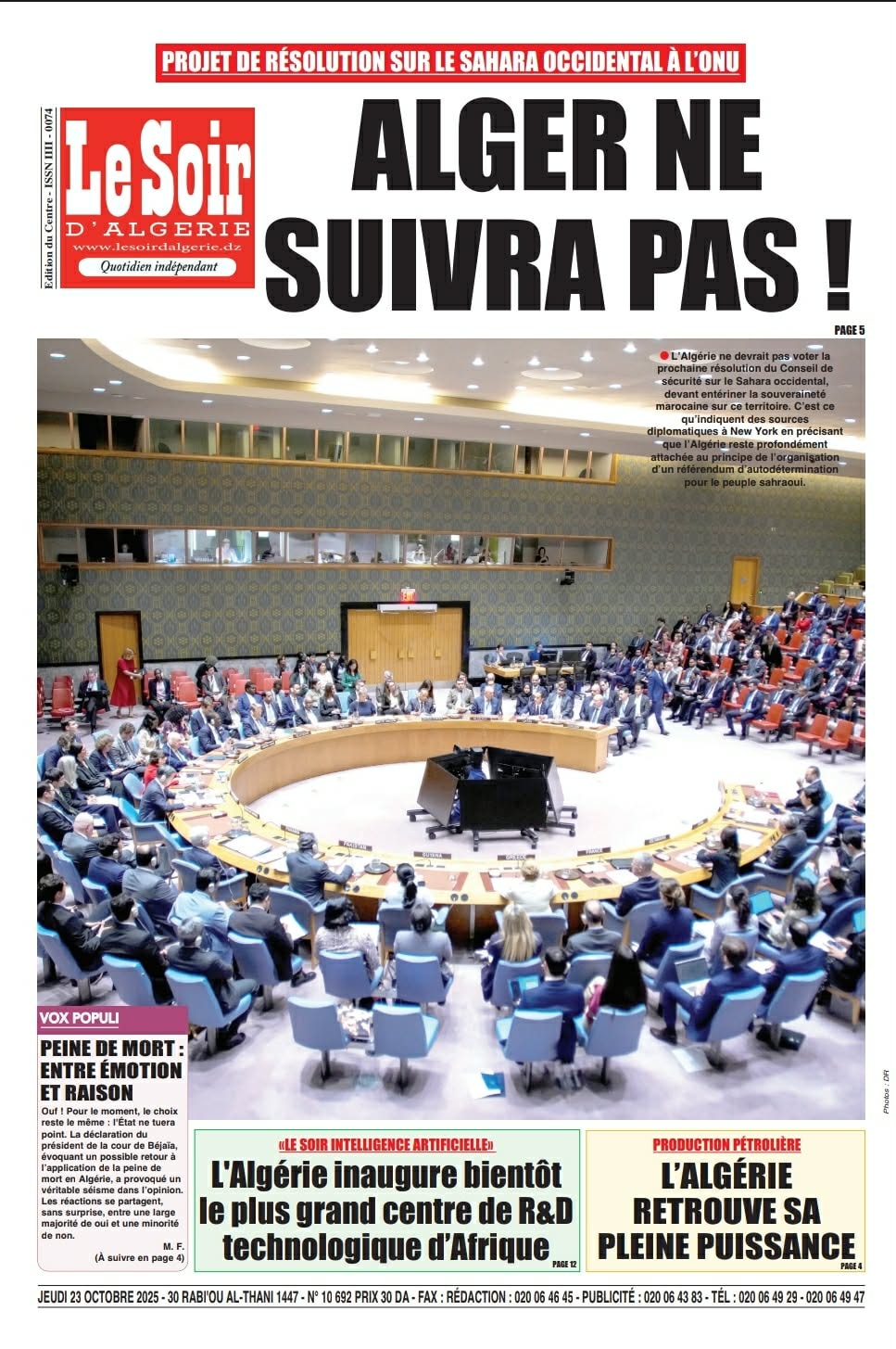 وقالت الصحف إن الجزائر ترفض التصويت على مشروع القرار القادم لمجلس الأمن التابع للأمم المتحدة بشأن قضية الصحراء. معتبرة أنه يُعد انتهاكًا صارخًا لقرارات الأمم المتحدة السابقة التي تؤكد على حق الشعب الصحراوي في الاستفتاء على الاستقلال.