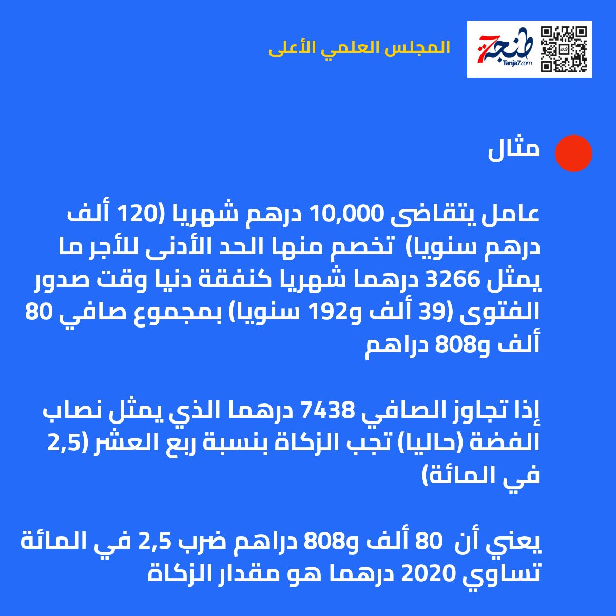 وتجُبُ الزكاة في هذه المداخيل بنسبة ربع العشر (2.5%) إذا بلغت النصاب (7438 درهمًا بناءً على قيمة الفضة حاليًا)، بعد خصم تكاليف التسيير ومضي عام هجري. وقد اعتمد المجلس الأجر الأدنى كمرجع للنفقة في الأجور لأنه “يُقَدِّمُ اقتراحًا واضحًا على أساس الاجتهاد”، مُشِيرًا إلى أن ترك النفقة بدون تحديد “بدعوى اختلاف نفقات الناس في معاشهم من شأنه ترك المجال للتقديرات الشخصية”، وأن هذا التحديد “في صالح ذوي الدخول الدنيا أكثر مما هو في صالح من فوقهم”.