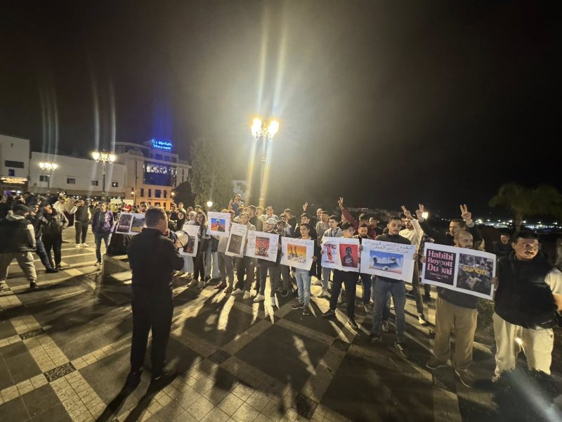 رفع محتجون بسور المعكازين بطنجة، شعارات ضد دولة الإمارات، خلال وقفة تضامنية مع الشعب السوداني، بسبب ما يتعرضون له من انتهاكات، جراء الحرب الأهلية.