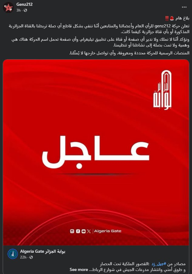 هذا وقد نشرت المجموعة عبر صفحتها الرسمية الجديدة بلاغا تنفي فيه علاقتها بذباب جزائري، أقدم منذ انطلاق الاحتجاجات على نشر أخبار مفبركة، تزعم حصار القصور الملكية، ونسب ذلك لمسؤولي مجموعة جيل زد عبر تطبيق “تليغرام”.